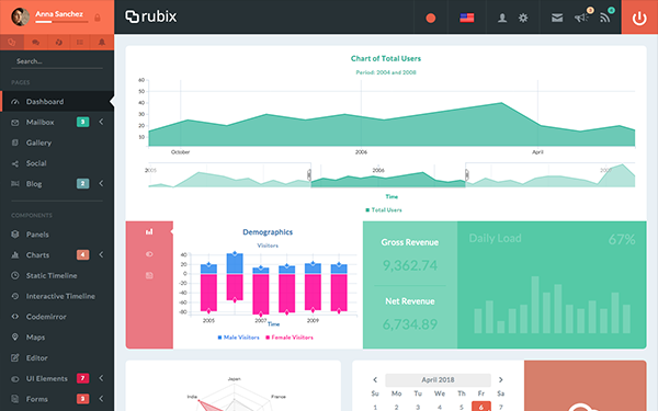 We also make use of SASS preprocessor for CSS (includes mixins for creating your own color schemes and themes) and gulp (a streaming build system) for managing and automating the asset pipeline. Rubix also includes Twitter's awesome css-flip module for generating RTL stylesheets.
